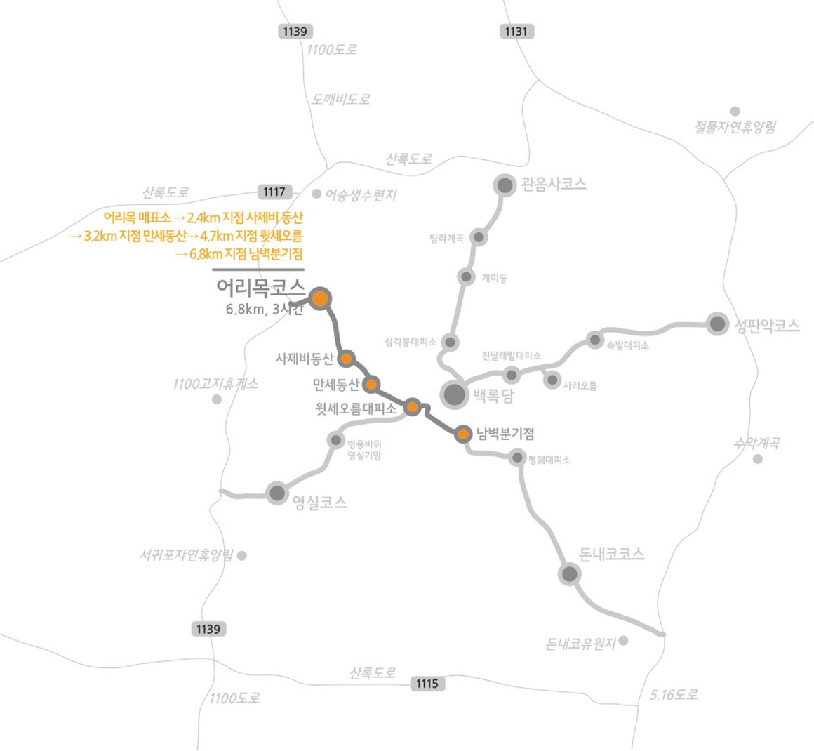 - 지도 포인트 : 어리목 입구 ~ 어리목계곡 ~ 만세동산 등 4.7 km 산책/트레킹 코스.