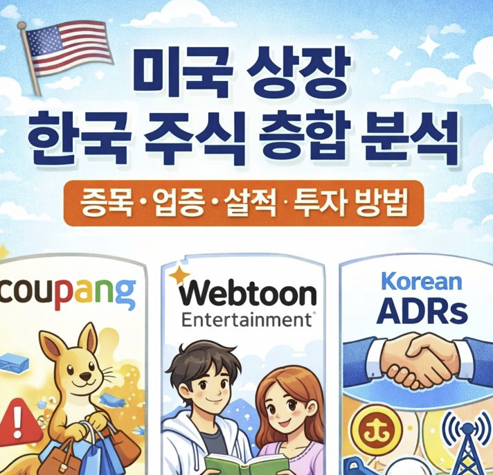 미국 증시는 전 세계 투자자가 참여하는 대표적 금융시장입니다. 한국 기업 중 일부는 직접 상장 또는 ADR(미국예탁증서) 형태로 미국에서 거래되고 있습니다. 해외 투자자 입장에서 한국 관련 미국 상장 주식을 분석하려면 종목, 업종, 실적뿐 아니라 글로벌 이벤트 리스크까지 이해하는 것이 중요합니다.특히 최근 이커머스 대표주 **쿠팡(Coupang)**의 개인정보 유출 사건이 투자 심리에 영향을 주며 주가 변동성과 리스크 요인으로 부각되고 있습니다. 본 글에서는 종목 리스트, 업종 특성, 실적·전망, 투자 방법까지 한 번에 정리합니다.📈 1. 미국에 상장된 한국 관련 종목 리스트➤ ① 직접 상장된 한국 기업종목 명 / 티커 / 상장 거래소 / 업종CoupangCPNGNYSE이커머스 / 기술Webtoon E..